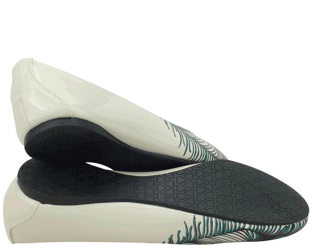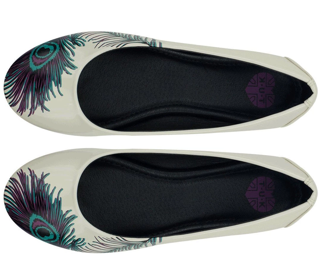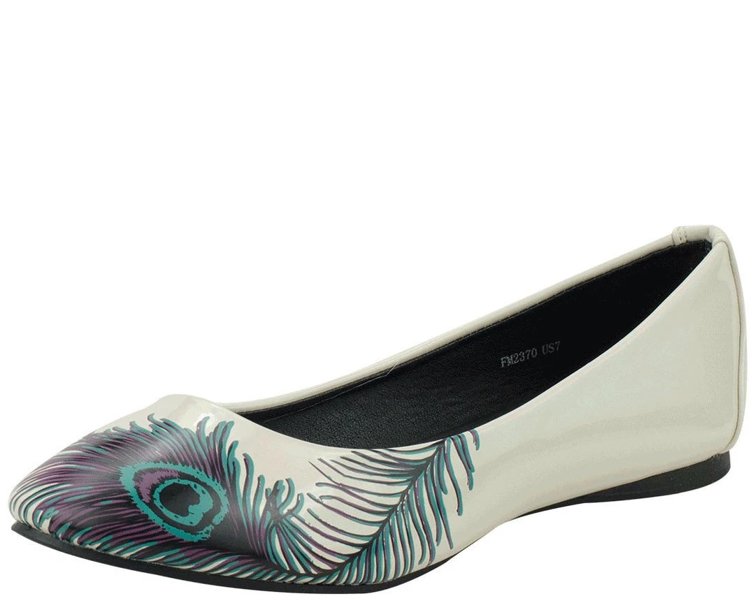 Shake your tail feather with our stylish cream peacock feather flats! A purple and blue peacock feather is printed over the toe of cream shine faux leather for an elegant shoe that complements just about any outfit. Vegan friendly.