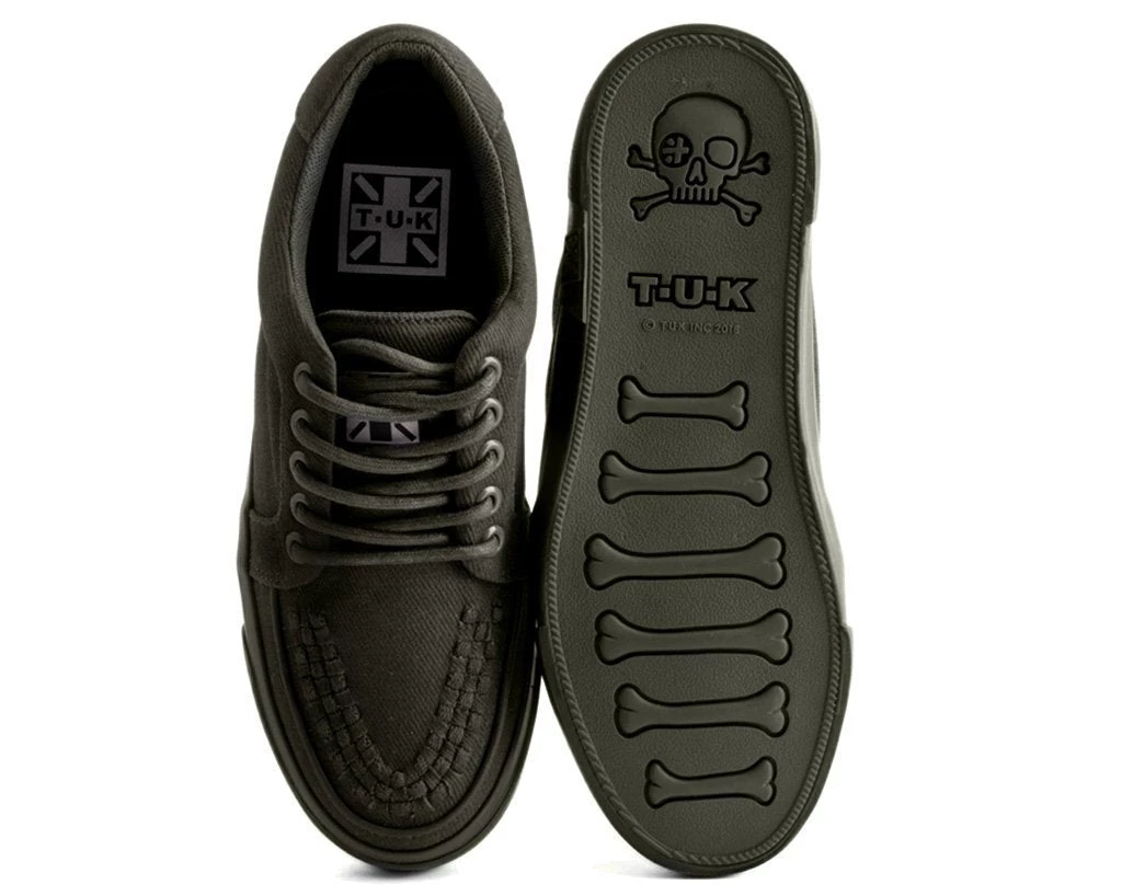 Appeal to your rebellious spirit with these army green sneakers. Features a vegan friendly solid coated canvas upper on our vulcanized VLK creeper sneaker silhouette that lends everyday wearability. Interlace closure and has a lightly padded tongue along with removable memory foam insoles for added comfort.