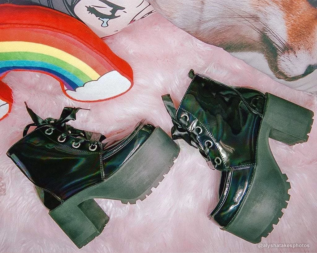 Say βholoβ to your new favorite booties. These stunners feature a black patent holographic upper complemented by black satin laces for an extra eye-catching touch. These platform boots have a 3.5β chunky block heel height for a sturdy, elevated lift. Vegan friendly and made of all man-made materials.