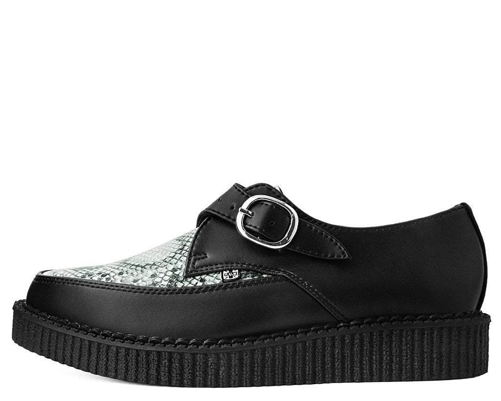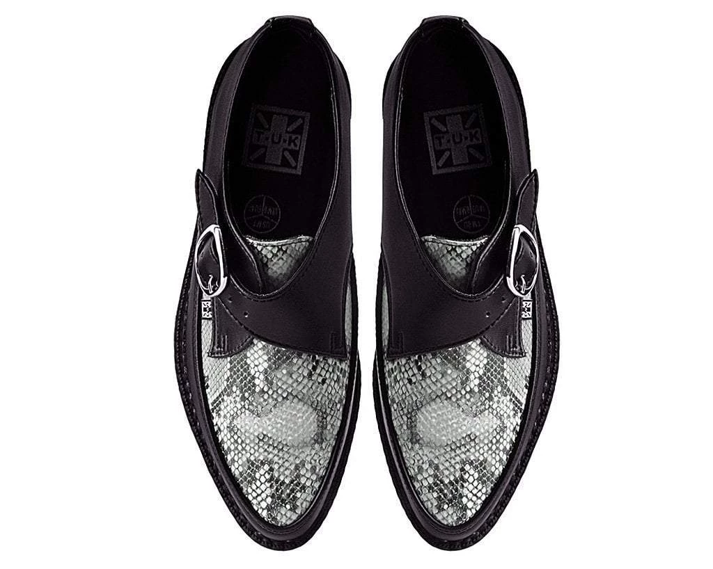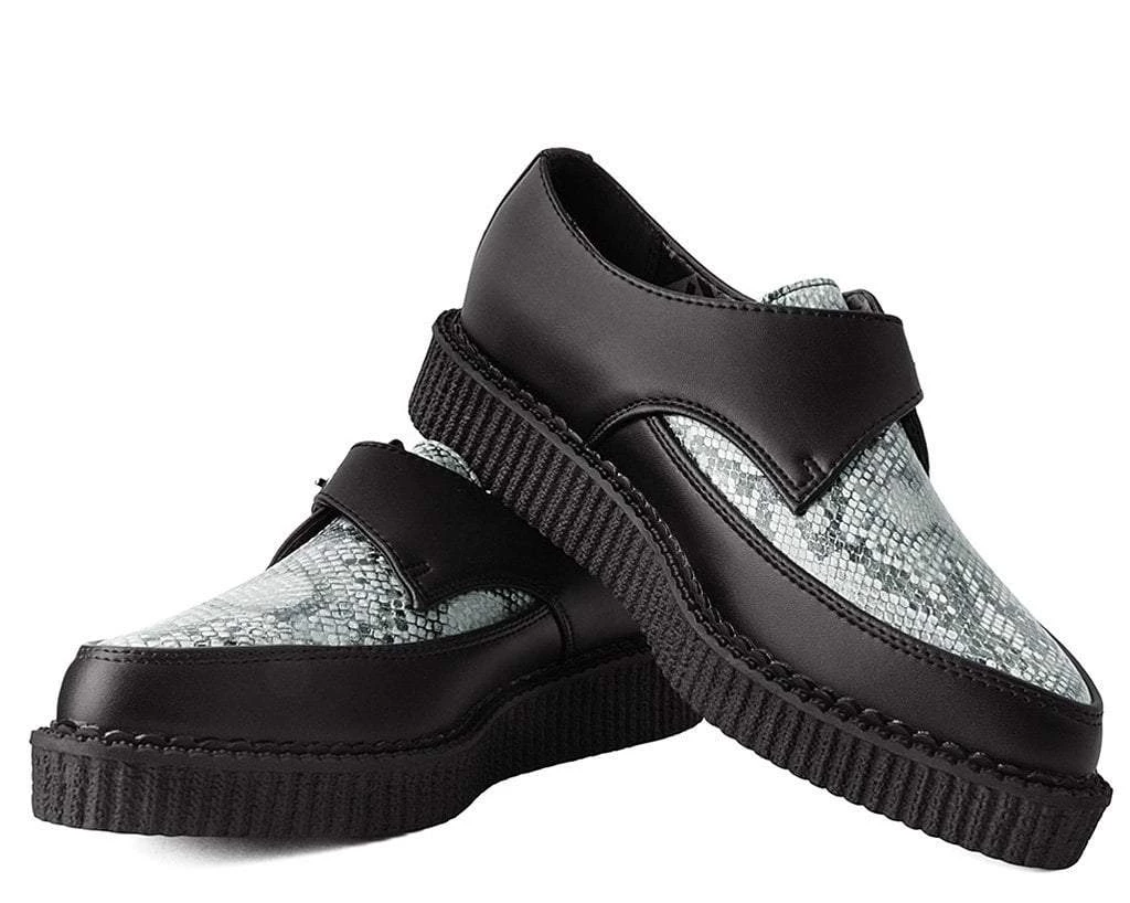 Add some s-s-serious style to your shoe game with these sharp creepers. Features a pointed toe construction with a faux grey snakeskin patterned vamp contrasted by a black synthetic upper. Has a monk buckle strap closure and a low sole creeper platform that measures 1 ¼” at the heel and ¾” in the front and has removable memory foam insoles for added comfort. Vegan friendly – no snakes were harmed in the making of this shoe!