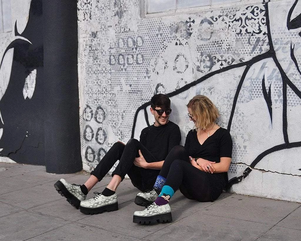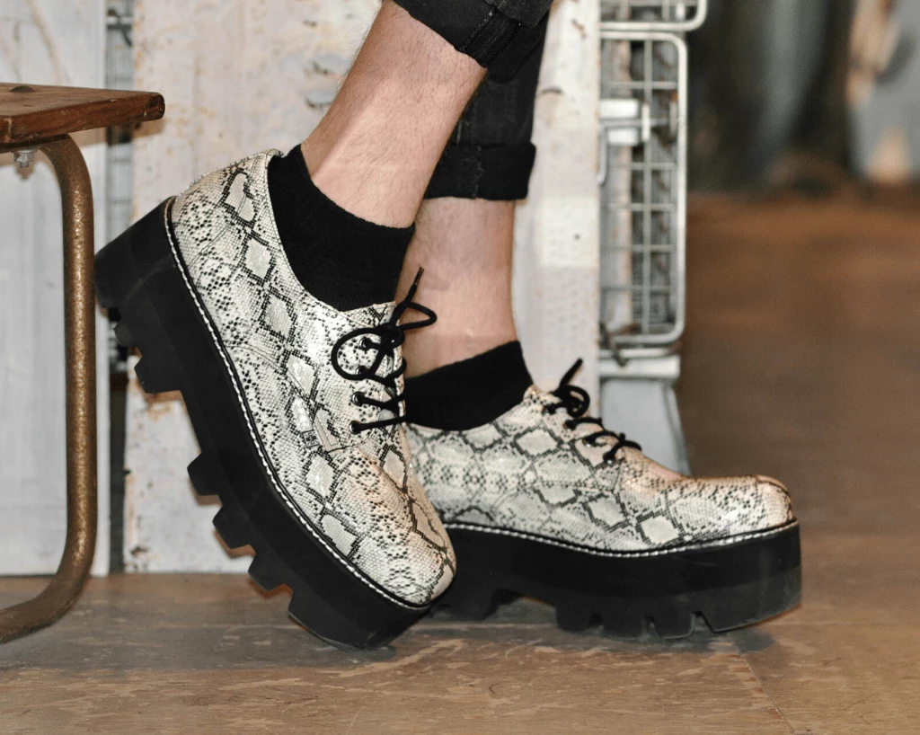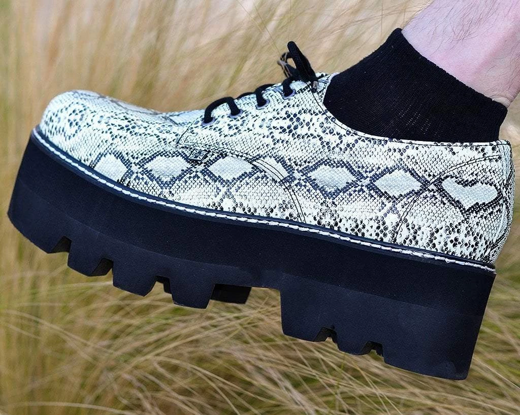 Get ready toΒ slither straight into hearts. Amp up your shoe game with these Gibson style shoes featuring a cool, dino lug platform sole. Features a vegan friendly Glow In The Dark snakeskin upper and has black laces for a finishing touch. Has a sole height that is approximately 2 1/4β at the heel and 1 7/8β in the front. Has removable memory foamΒ insoles for added comfort.