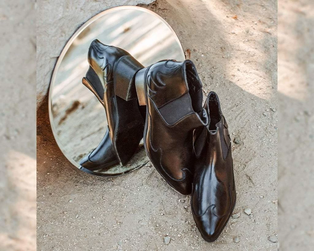 Be too hot to handle in these pull-on flame boots. Features a vegan friendly black faux leather upper with a pointed toe construction and complemented by black flame detailing. Has a block heel height of 2 ¼” and back zipper for easy on/off wear.