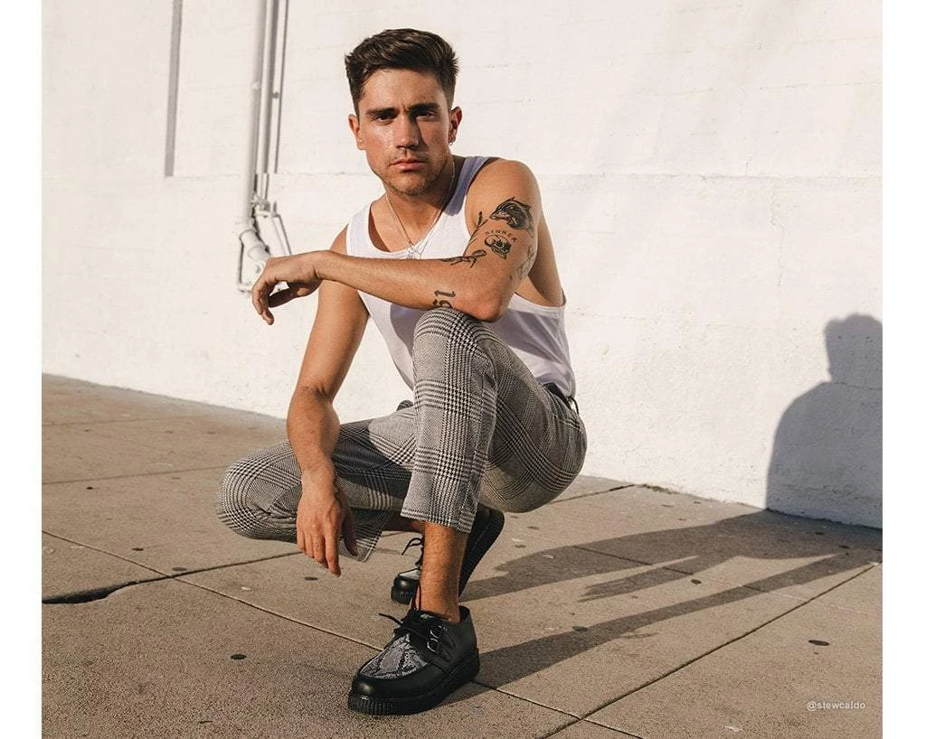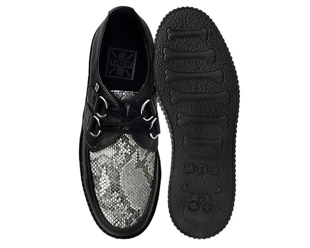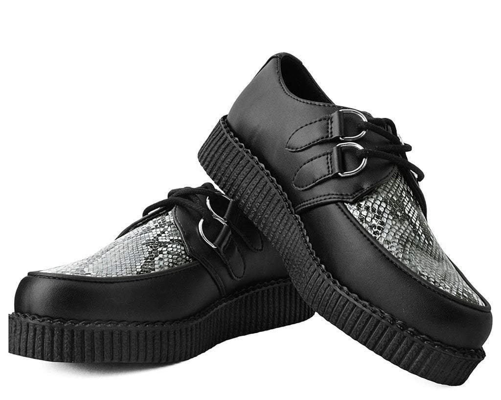Iconic style that wonβt quit. The timeless creeper that you know and love is back featuring a new sleeker sole that is more lightweight and flexible than ever. Features a low platform height that is approximately 1 ΒΌβ at the heel and ΒΎβ in the front and is made of a mixture of EVA and rubber that contributes to the soleβs bendability. Has a vegan friendly black faux leather upper complemented by a grey snake print vamp and removable memory foam insoles for added comfort.
