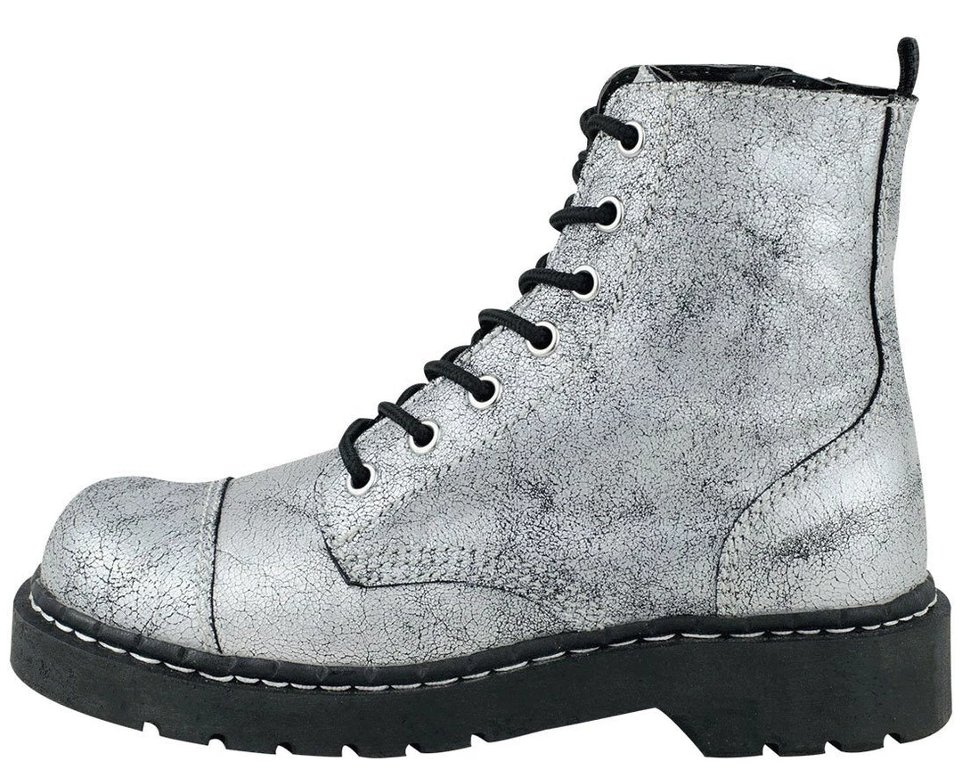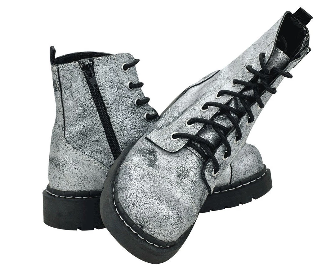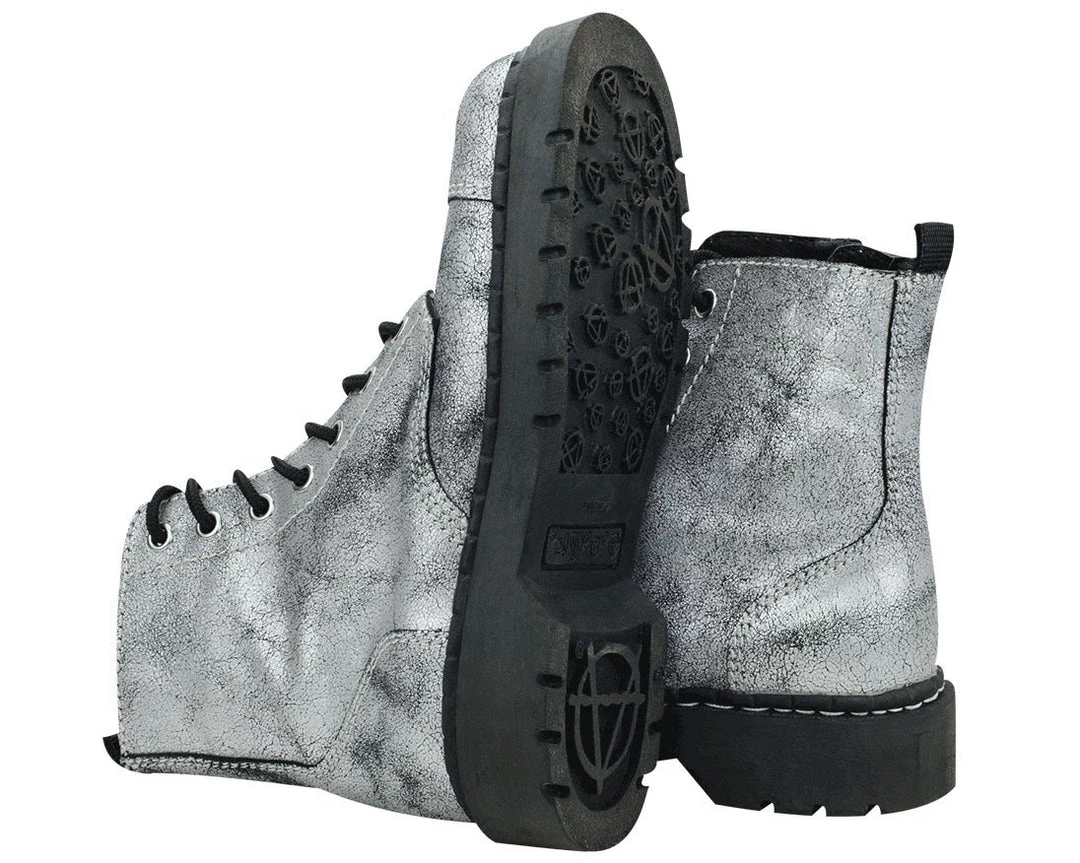 Lace up in these super cool silver cracked boots! These boots feature traditional lace up detail, suede silver overpaint, cracked detailing. The black rubber soles are about 1 inch in front and 1 1/2 inches at the heel and have our signature Anarchic tread pattern so you can leave your path of destruction with every step.Â