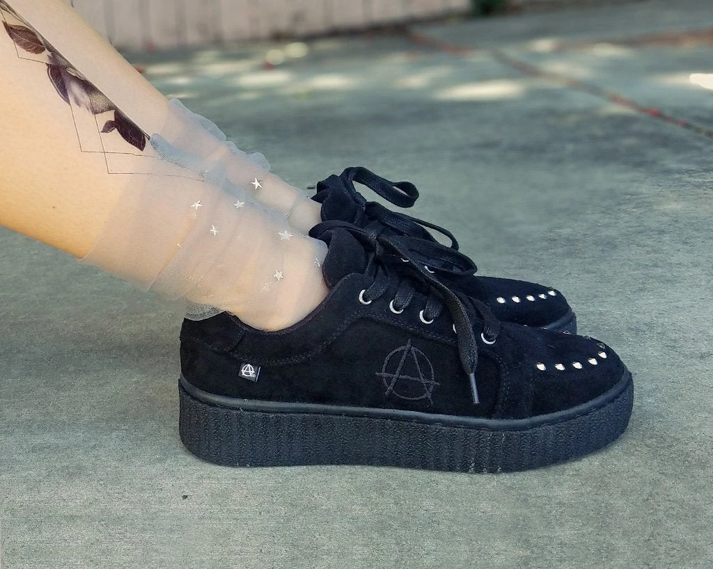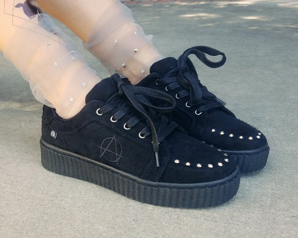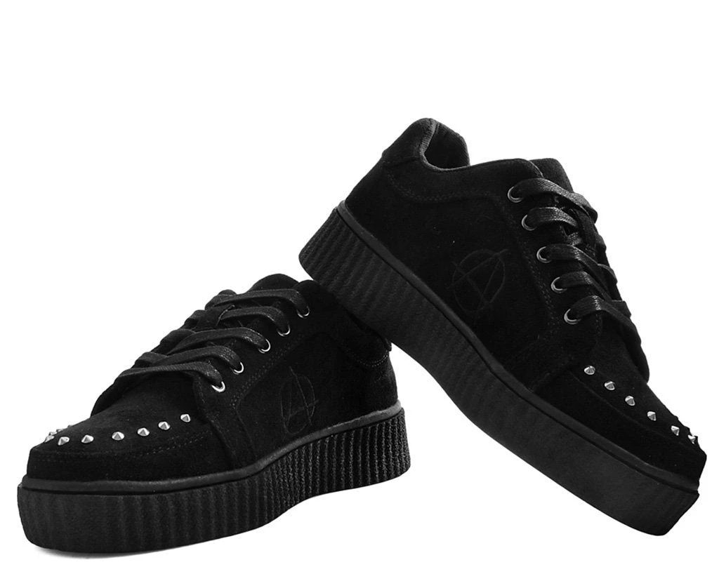 Step into T.U.K. Anarchic R!OT Creepers — A twist on the classic sneaker silhouette injected with signature T.U.K. elements and featuring our old school ’91 TPR sole! Features a vegan friendly black microfiber upper combined with spike studded detail along the toe and our anarchic logo on the side for a finishing touch. Has twill lining, lace up closure, foam padding insole, and a low sole platform that is about 1 ½” at the heel and ¾” in the front.
