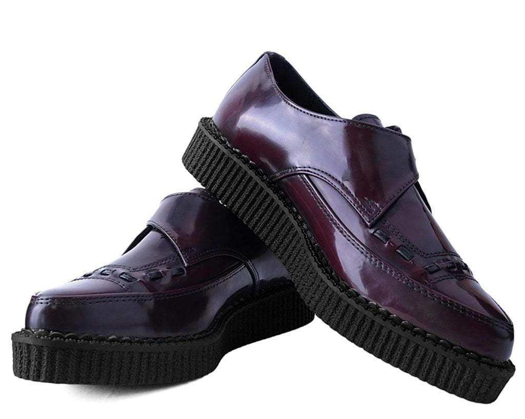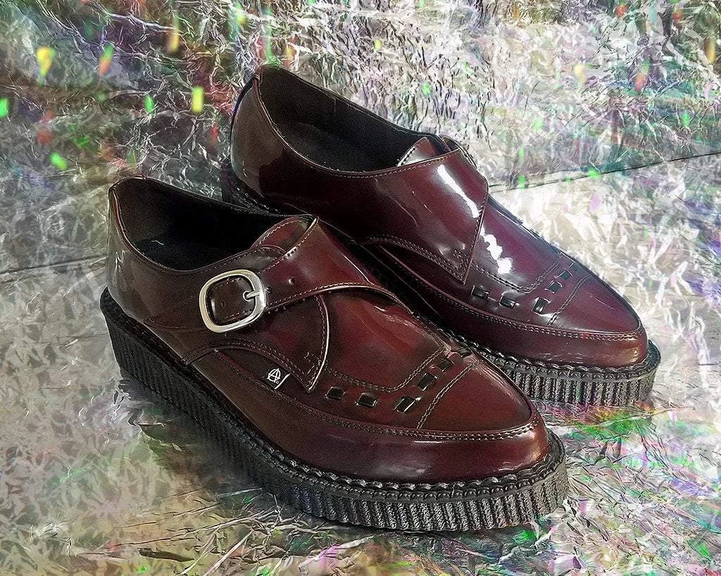 Go for bold and keep your shoe game looking sharp in these pointed-toe creepers. Features a vegan friendly faux leather burgundy rub-off upper that lends a worn and lived in look with a monk buckle strap closure. Has twill lining, foam padding insole, and a low sole platform that is about 1 ¼” at the heel and ¾” in the front.
