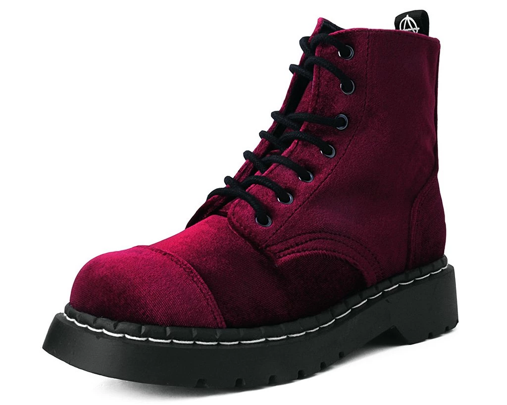 Up the ante in Anarchic Boots! Features a vegan friendly, combat style boot with a lush burgundy velvet upper and lace up detail. Has side zipper closure for easy on/off and a 1.5″ heel height.