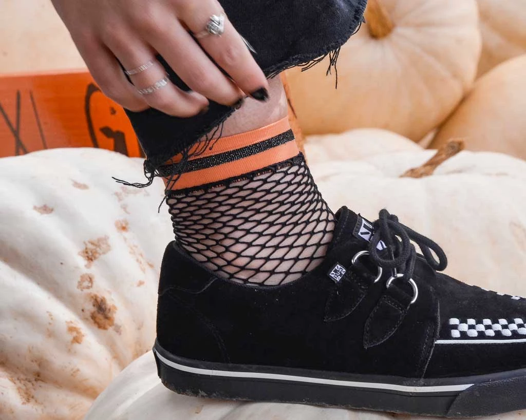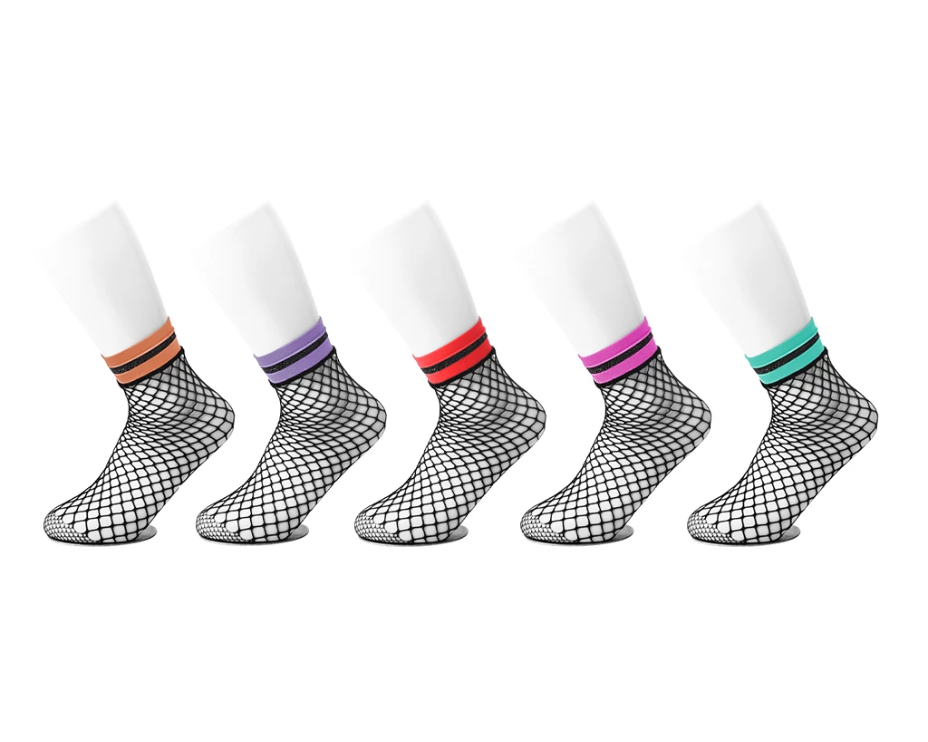Multi color band fishnet 5 pack crew socks. Each set comes with orange, red, purple, pink and teal.