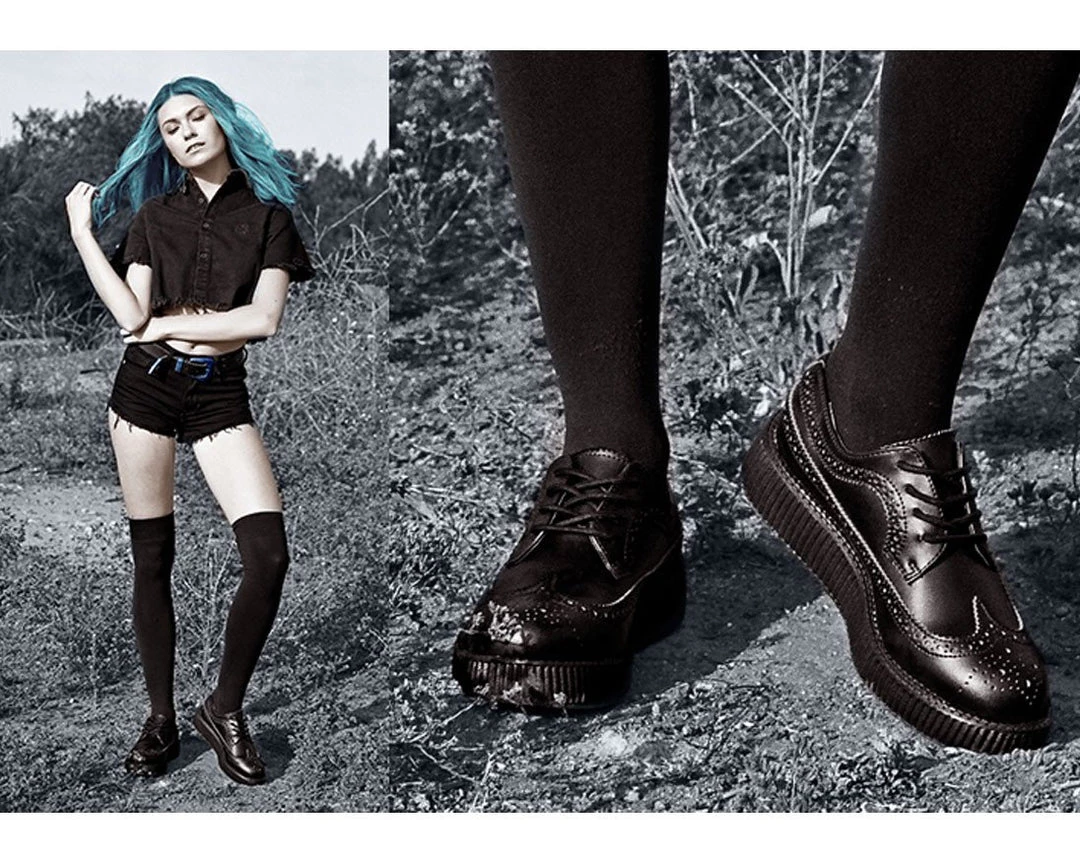 These leather T.U.K. Viva Creepers are a new way to wear all black shoes with style! These ain’t no ordinary creepers! Black on black wingtip and brogue details look slick and fashionable and make these shoes a staple that can be dressed up or dressed down. The VIVA lightweight low sole is about 1 1/2″ high at the heel and about 1″ high at the front of the shoe. These creepers are super cool and comfortable! Available in men’s US sizes 3-13.